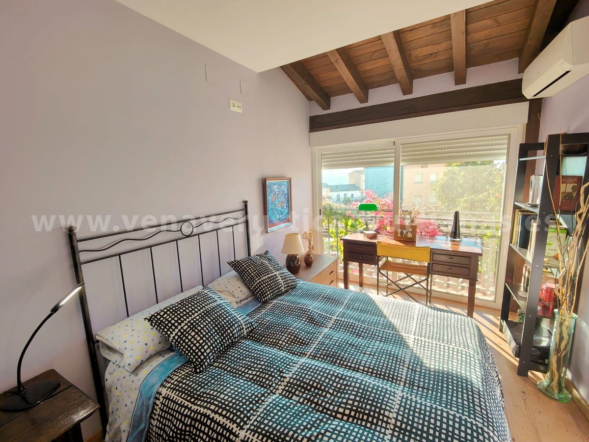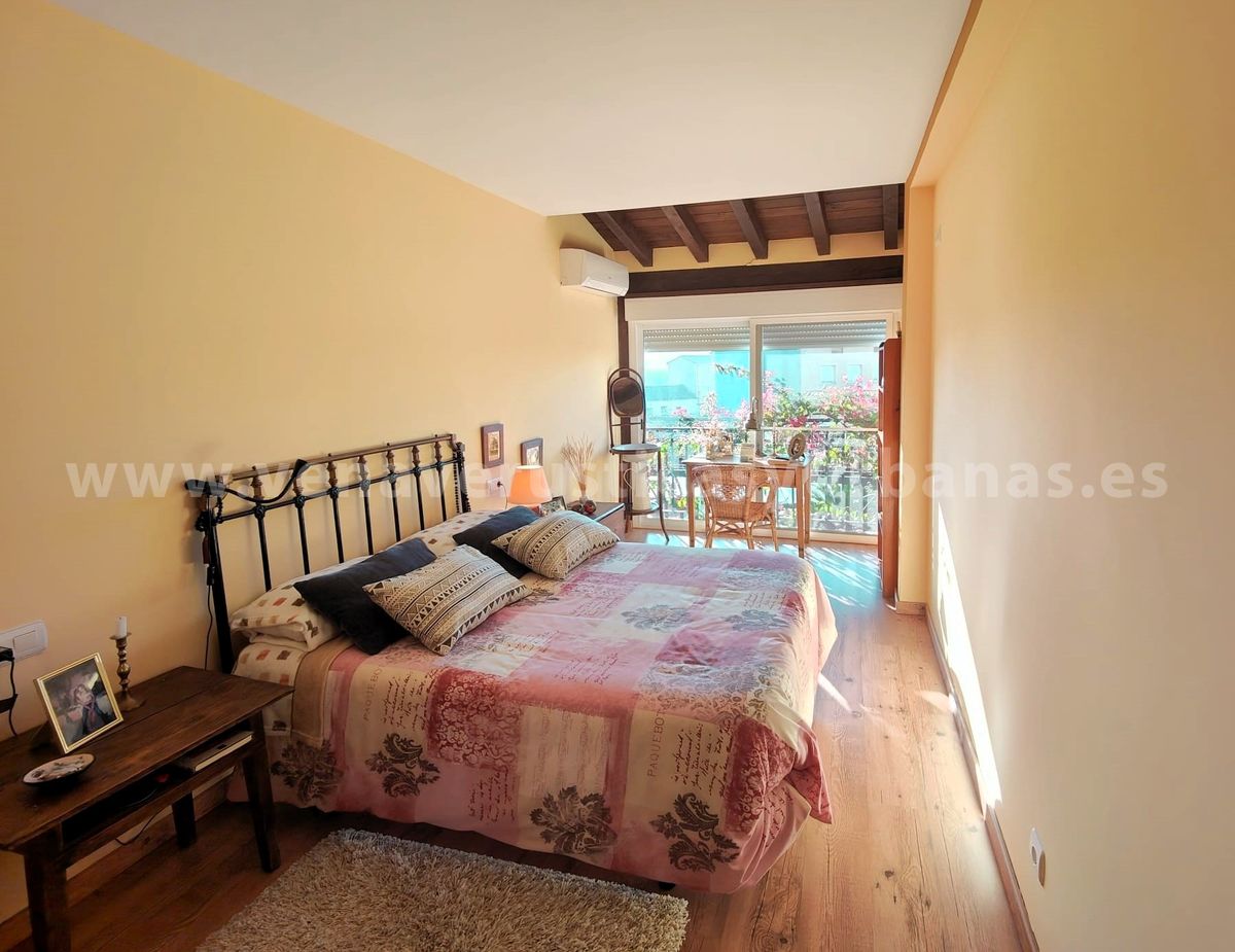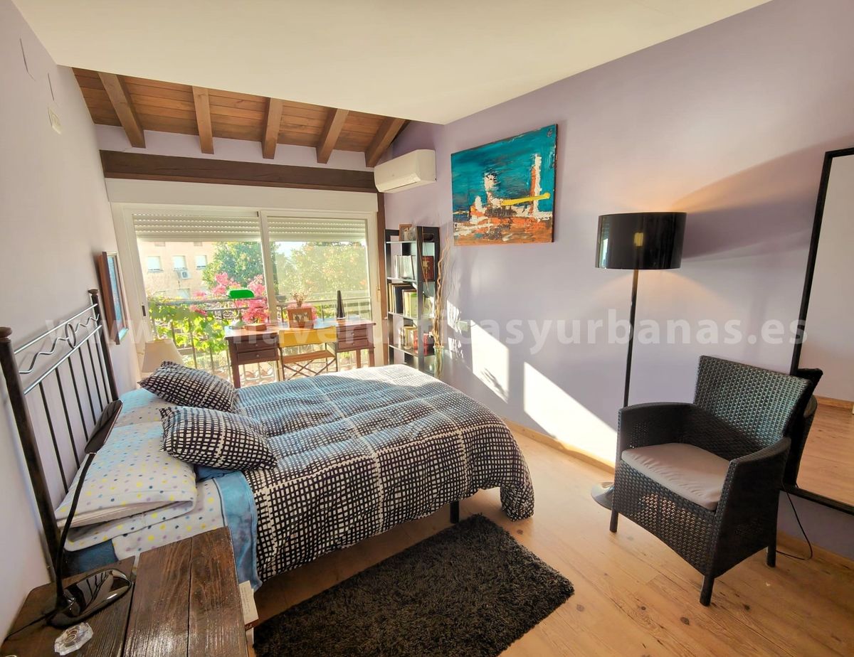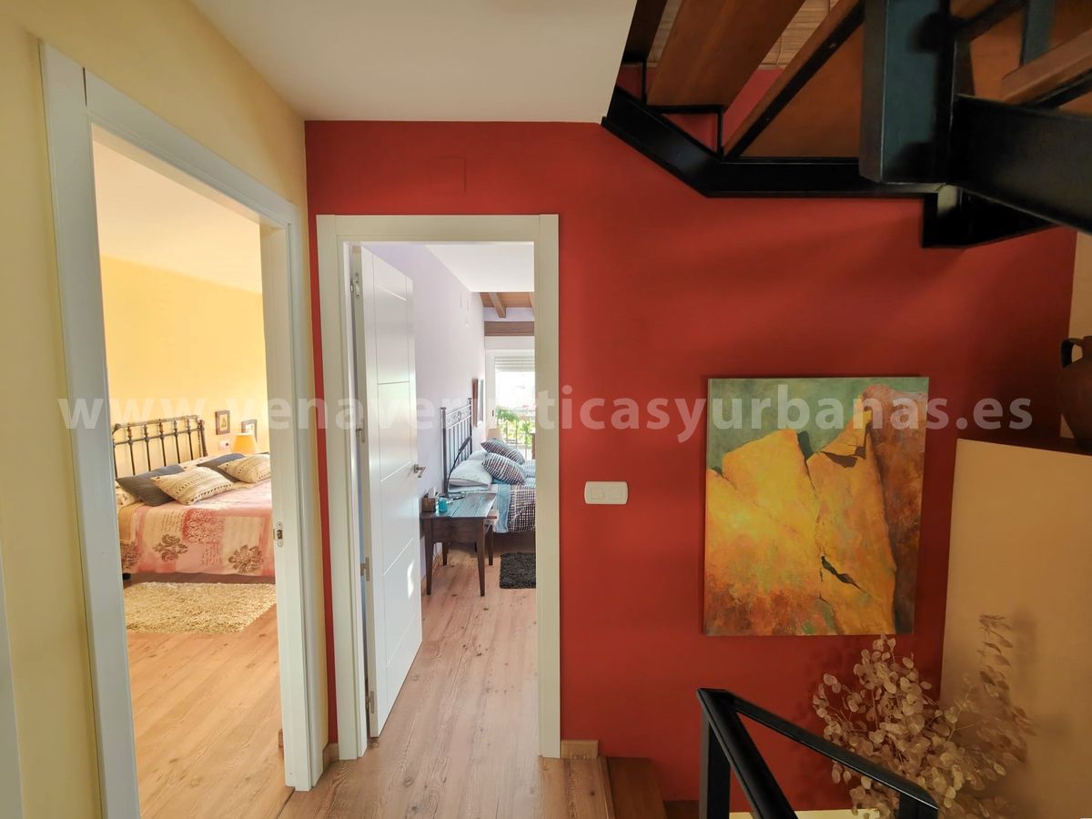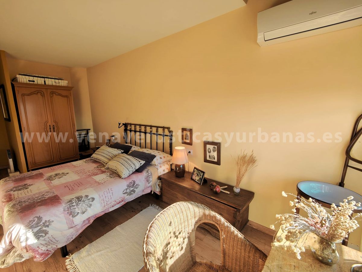 Planta primera: dos dormitorios, muy luminosos gracias a dos grandes balcones, con amplias vistas al sur, llegándose a divisar los perfiles del gran valle de los ríos Tiétar y Tajo entre las casas del pueblo. Cuenta con estructura para armarios empotrados, y un original juego de techumbre, con cuarterones de madera.