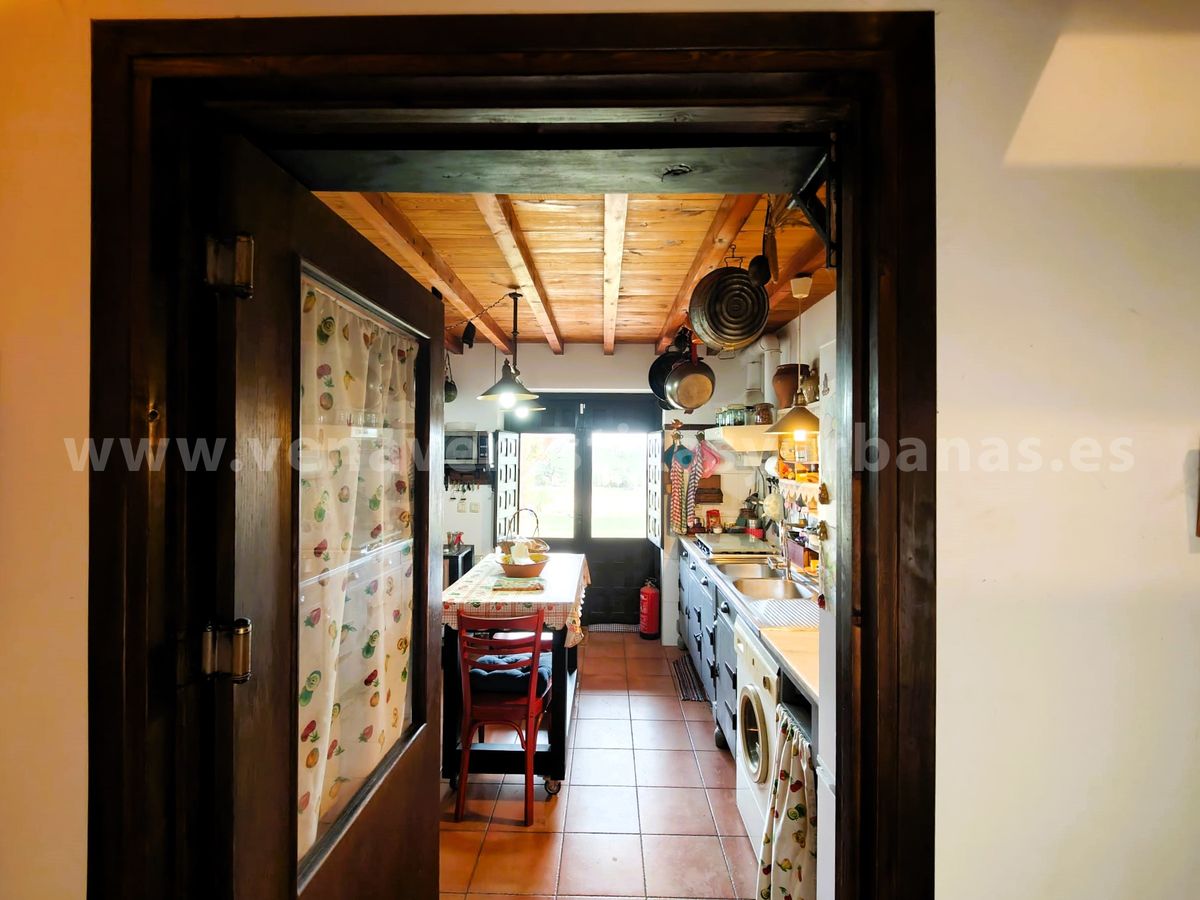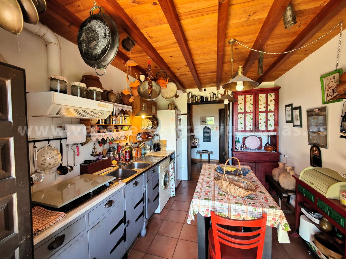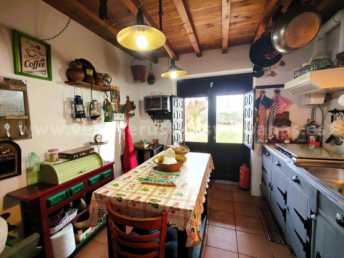 Romántica cocina, amueblada y equipada, con salida al porche, techos de madera y suelos rústicos.