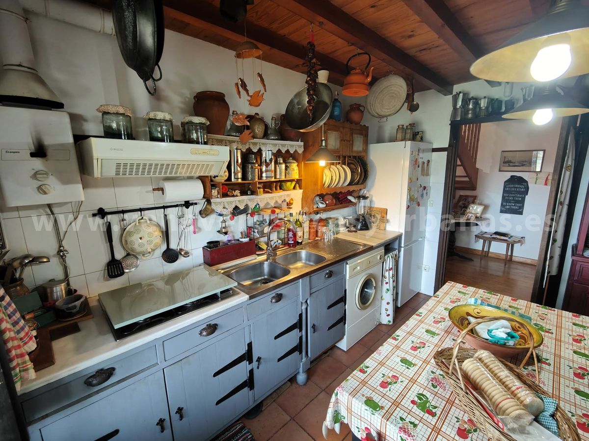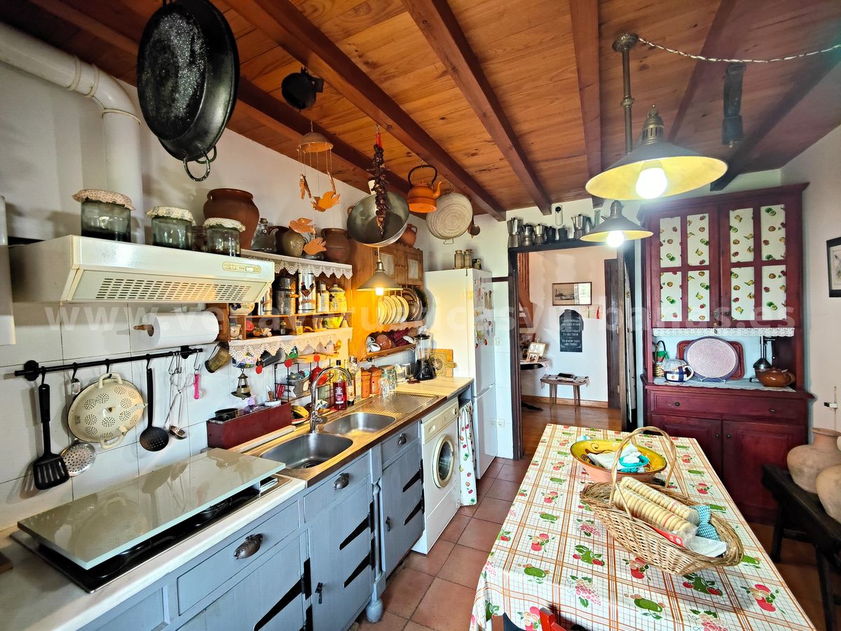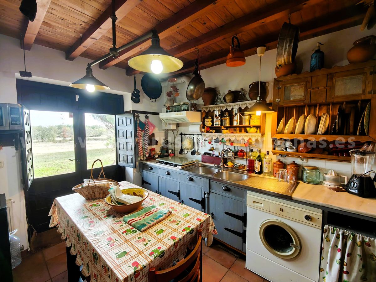 Romántica cocina, amueblada y equipada, con salida al porche, techos de madera y suelos rústicos.