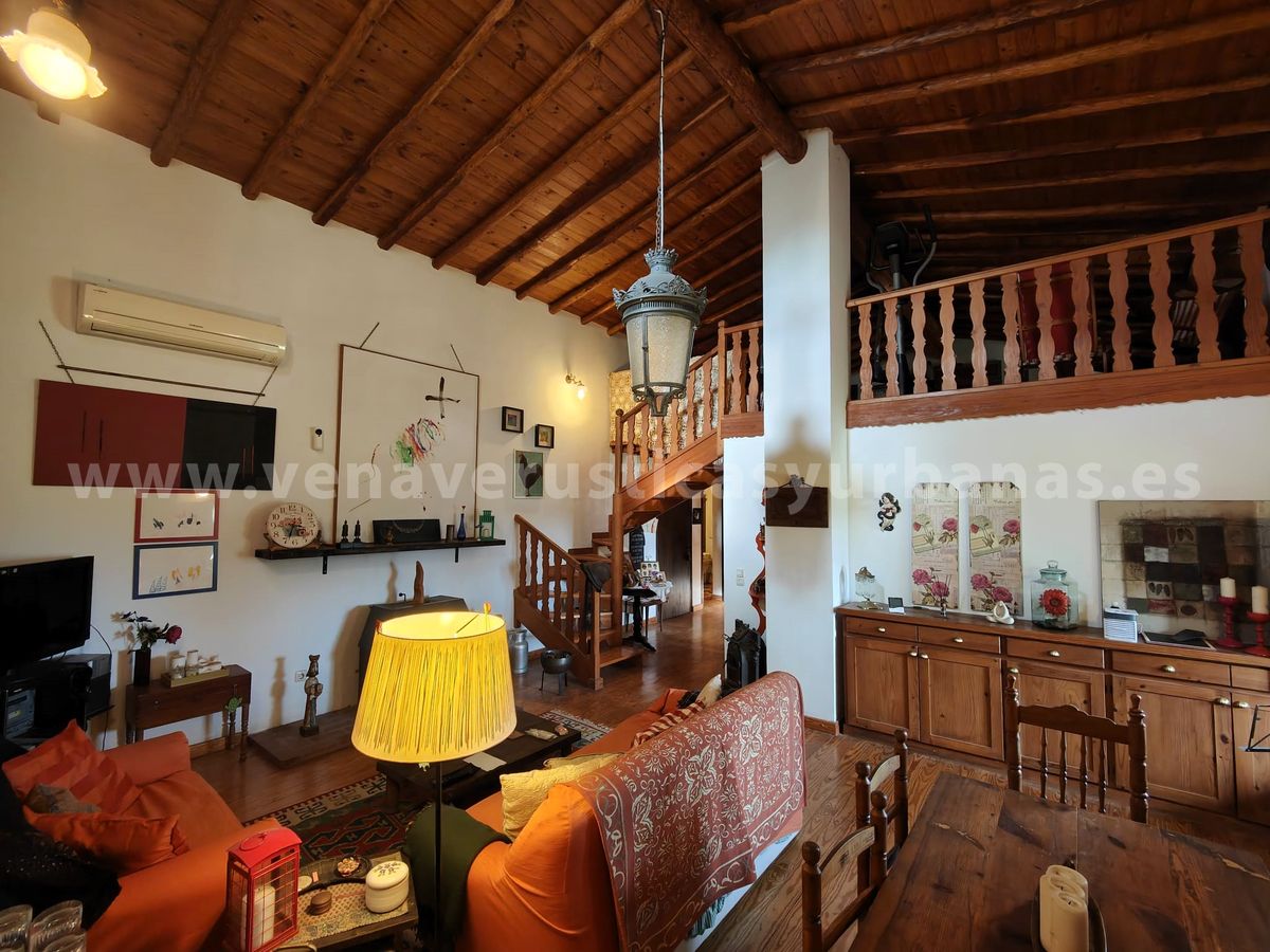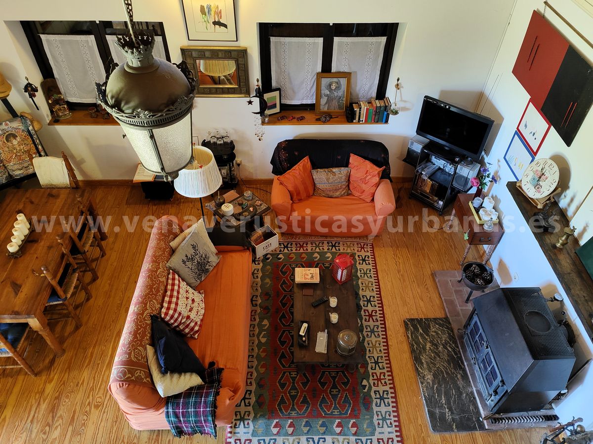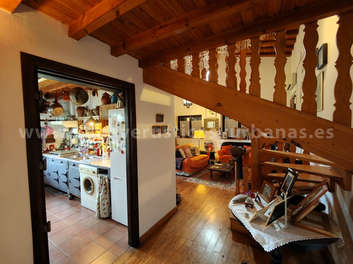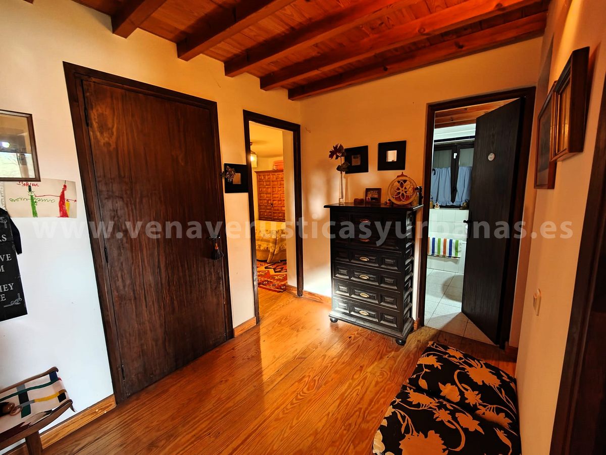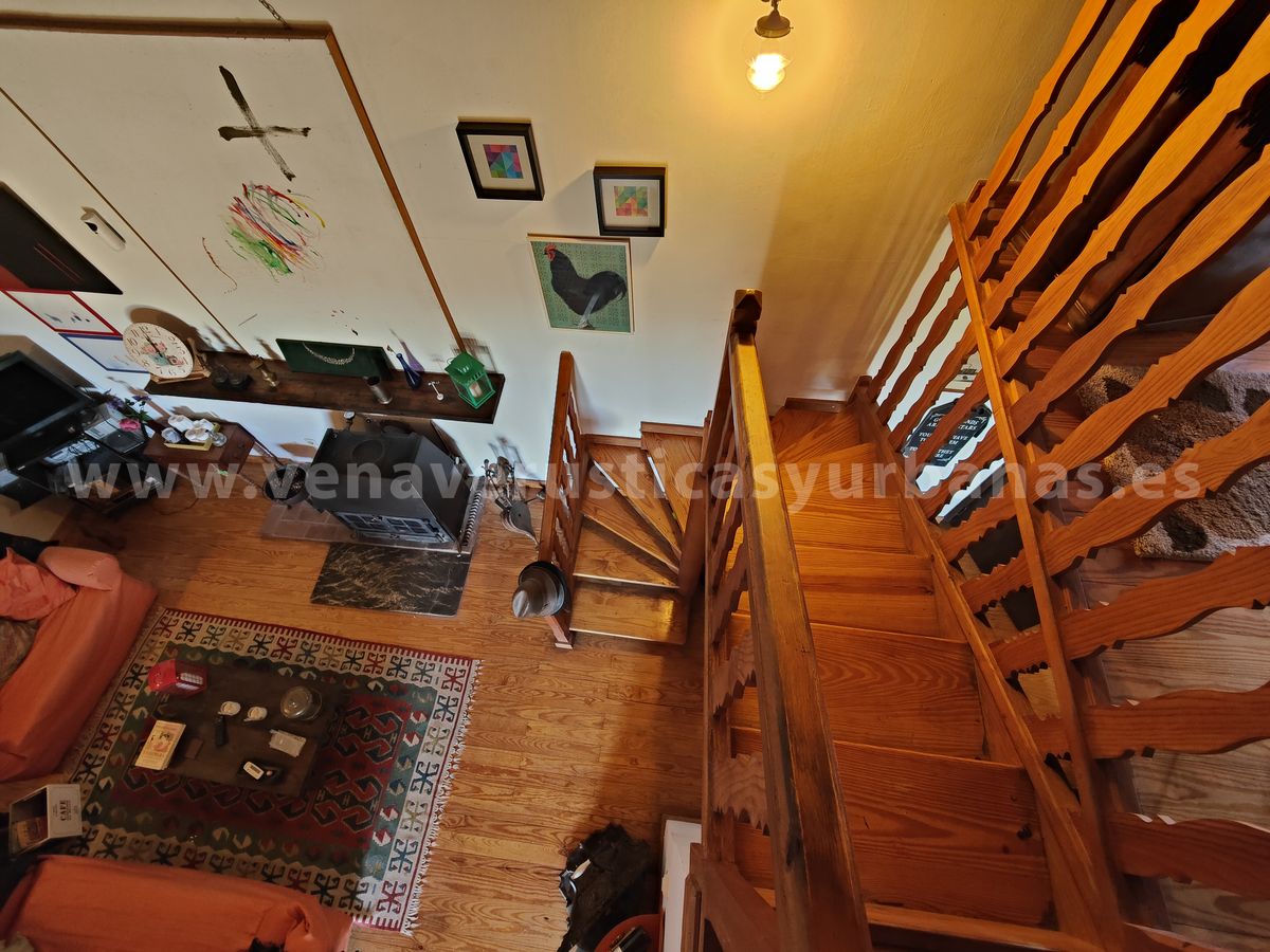 El salón se abre a un vestíbulo distribuidor, y desde este punto una escaleras de madera nos llevan al piso superior, una bella y amplísima bajo cubierta con vigas de madera, muy luminosa igualmente, que consta de cuatro grandes ventanas, (dos con acceso a la terraza) y se abre sobre el salón, con un bonito antepecho de madera labrada.