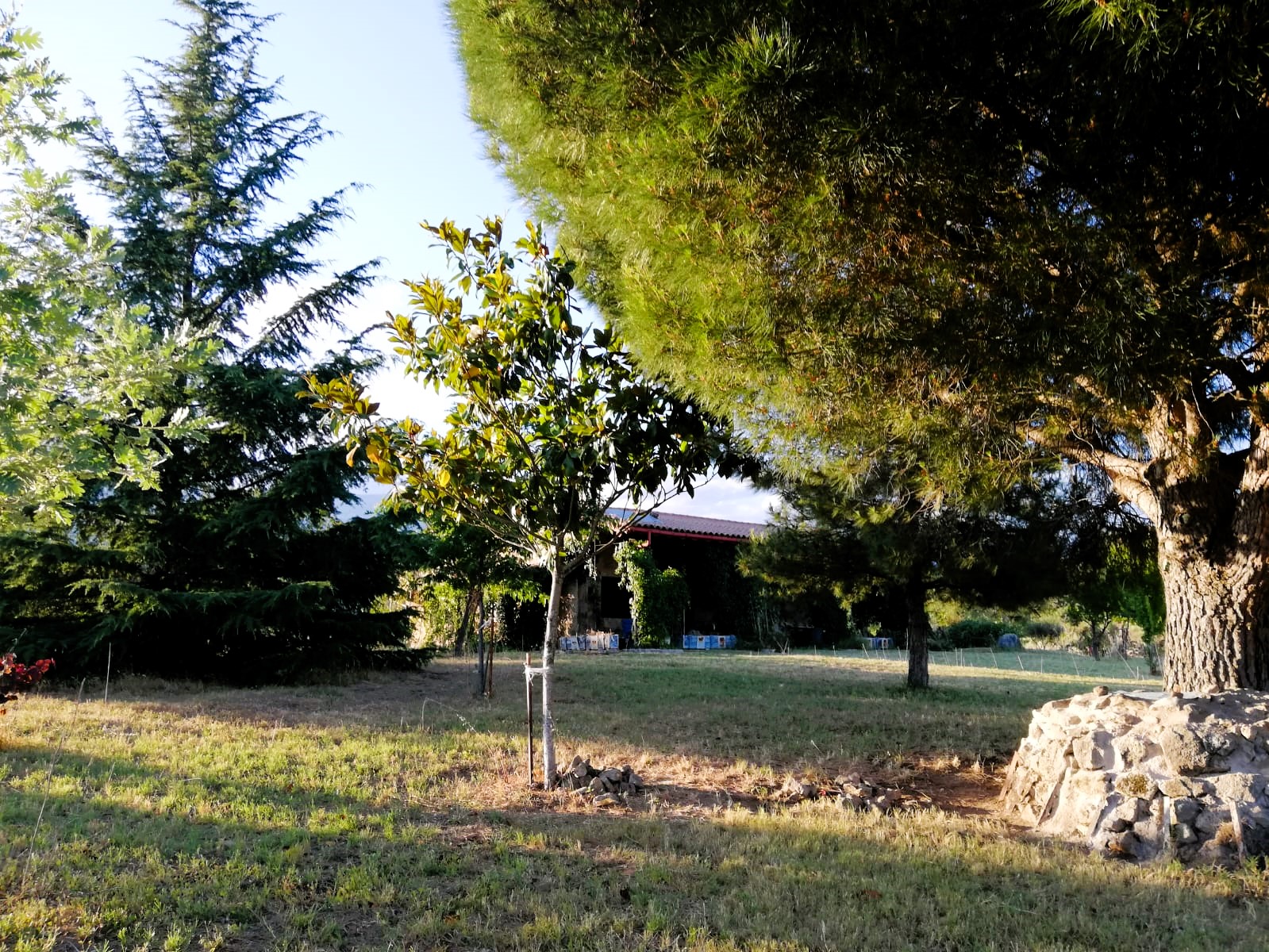 En la zona ajardinada junto a la vivienda, crecen adelfas, abetos, un gran pino piñonero, muy vistoso, madroños y otros árboles ornamentales.