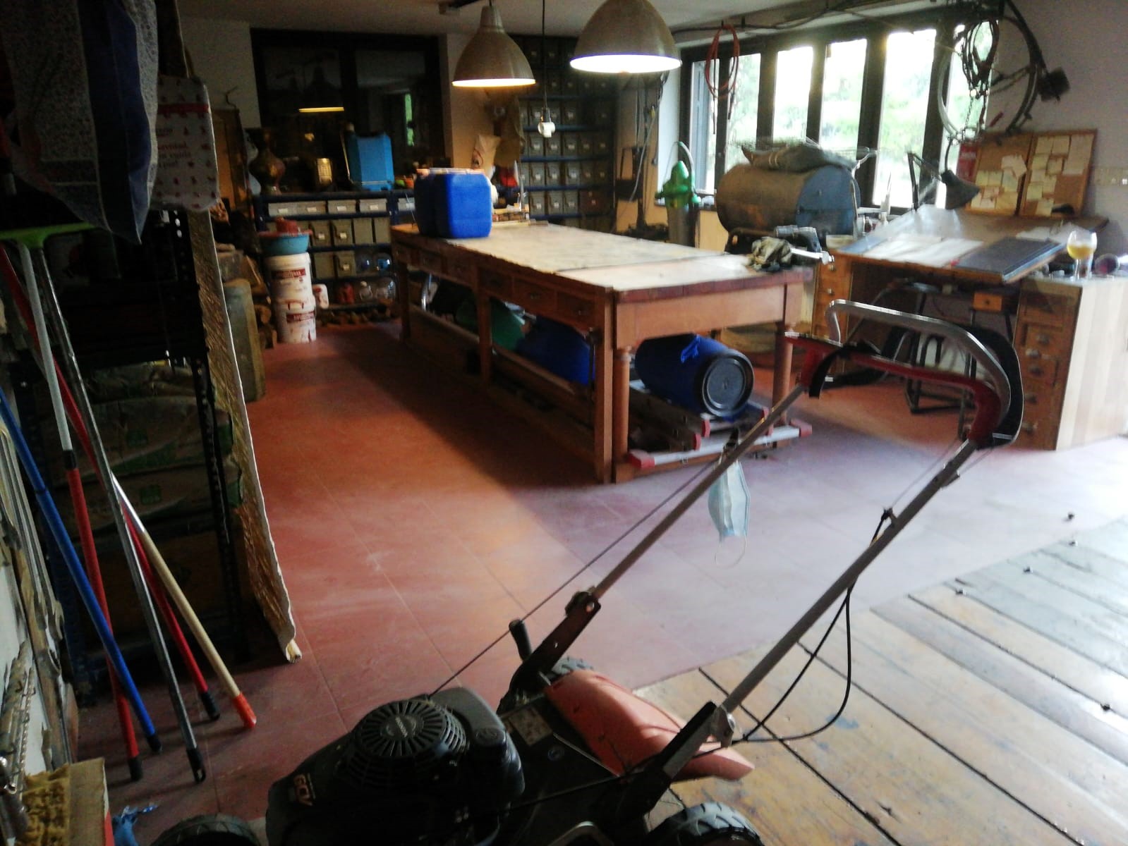 Desde el distribuidor pasamos a un amplísimo espacio multifuncional y versátil, muy luminoso, que hoy se destina a taller, pero que puede ser estudio, dormitorio, comedor, garaje etc….( en el caso de ser garaje, consta incluso de hueco para arreglo de vehículos).