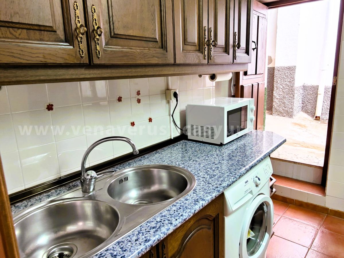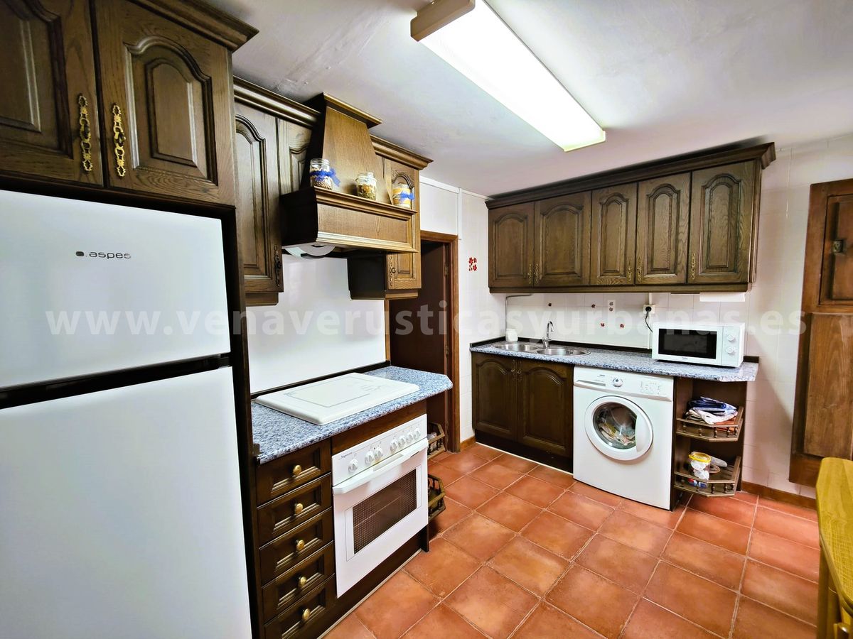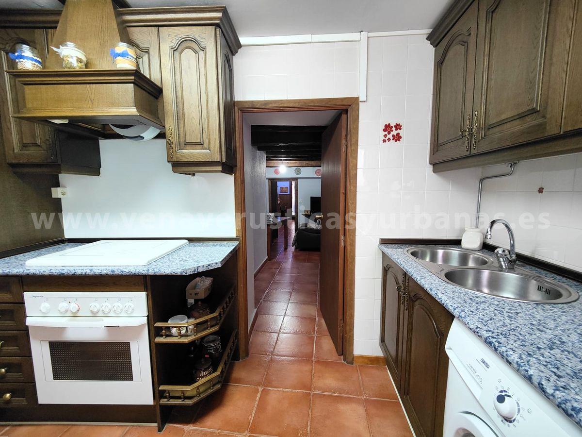 La cocina equipada y amueblada, tiene acceso a la calle y espacio para poner mesa para comer. La calle es peatonal, sin tráfico e ideal para salirse al fresco, o a tomar el sol de mañana. De la cocina también parten las escaleras al piso superior, actualmente en bruto y dedicado a almacén-desván, ideal para una sala de estar o estudio-taller.Bajo las escaleras una pequeña despensa.