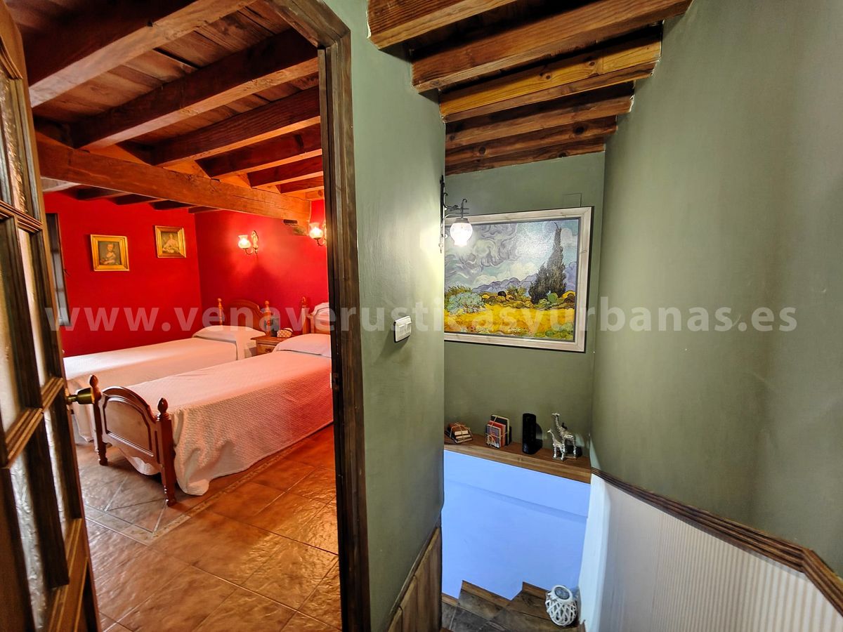 Primera planta: presenta distintos niveles y cuatro dormitorios: el primero según subimos es un dormitorio muy amplio, con balcón a la calle de situación y preciosos techos de viguería de madera (fácilmente convertible en salón). Otro dormitorio con ventana a patio, y baño, y otro par de dormitorios, exteriores, uno de ellos con baño completo con bañera.